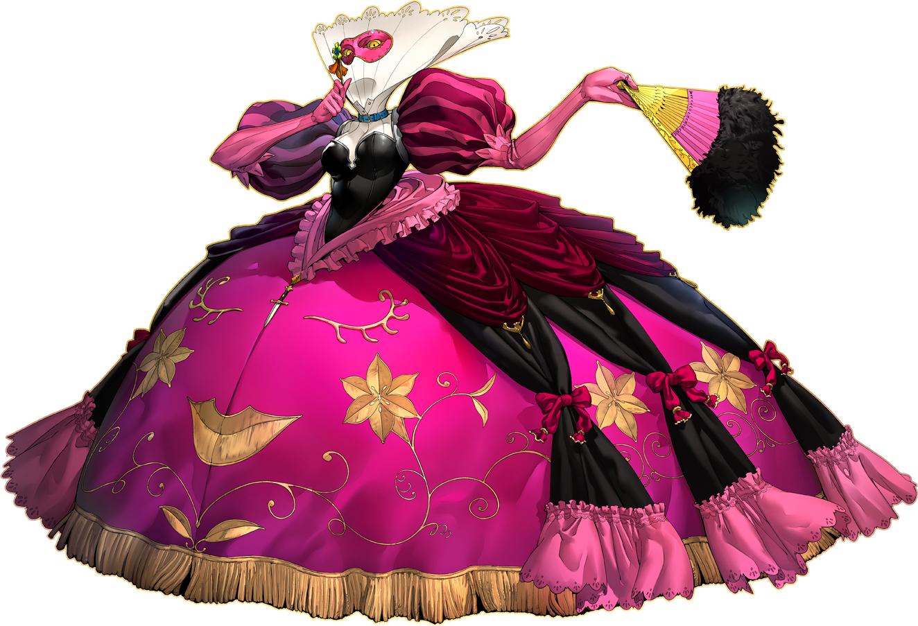奥村春の初期ペルソナ、「ミラディ」。百合の刺繍に飾られた美しいドレスをまとう貴婦人のペルソナ。しかし優雅なスカートの下には、強力な武器が隠されている。三銃士に登場する女傑と同じ名を持つ。