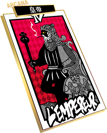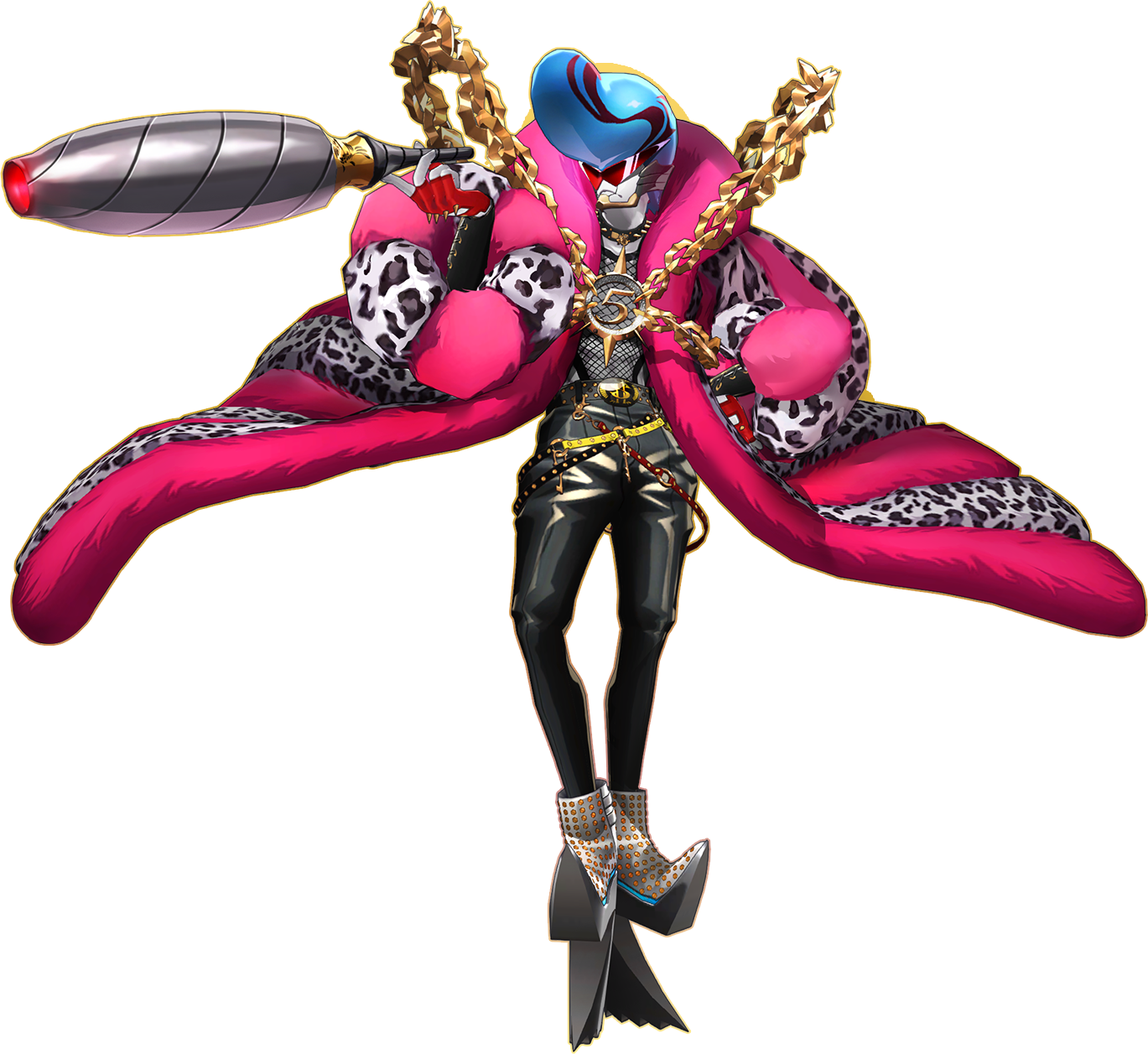 喜多川祐介の初期ペルソナ、「ゴエモン」。東洋風の華やかな衣装が目を引くペルソナ。巨大な煙管を構えた粋な立ち姿と、歌舞伎役者のような顔が特徴的。伝説の大泥棒「石川五右衛門」を彷彿とさせる。